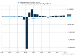 U.S. payrolls jumped 850,000 in June after two months of mediocre hiring (Figure 1). With these gains, the private sector has now reinstated 73% of the jobs lost during the pandemic. Restaurants and hotels led the hiring, as the leisure and hospitality industry added 343,000 new positions.