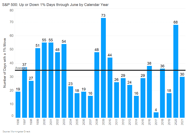 Like traveling, it seems like owning stocks used to be riskier. During the first half of the year, the S&P 500 moved more than 1% in either direction 30 times (Figure 2). Only 10 of the 30 moves were negative. While the S&P 500 dropped more than 30% during the initial stages of COVID-19, it has since rallied sharply and recorded several new highs. Sticking with the market through the pandemic challenges has paid off.