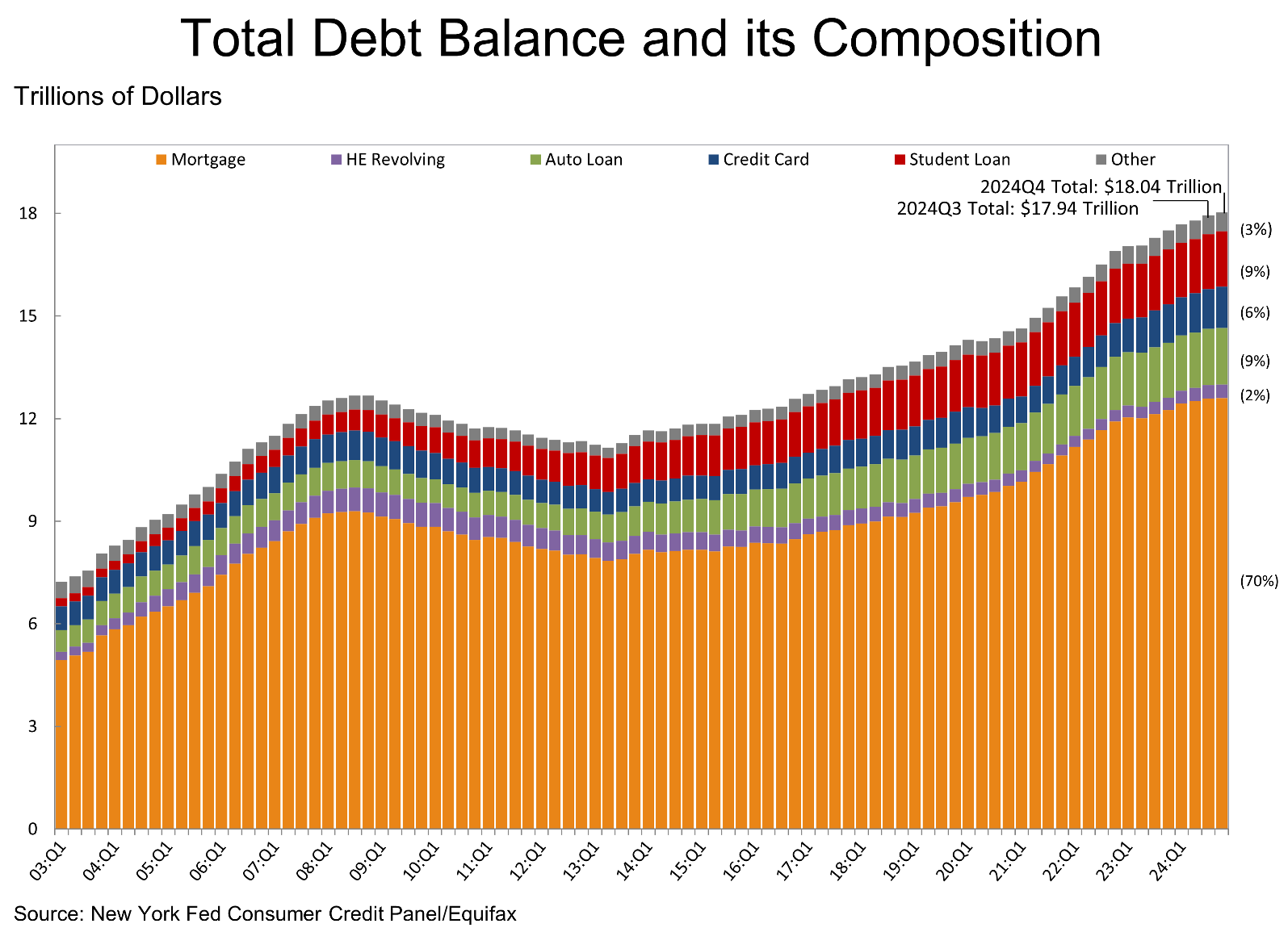 Credit card debt rose 3.9% last quarter (Q4 2024) to $1.2 trillion. Yikes! But credit card debt is under 7% of overall household debt. Total debt rose just 0.5% in Q4 to $18.0 Trillion, the slowest quarterly increase since Q2 2023. That’s because most household debt is mortgage debt ($12.6 trillion), and that’s barely increasing—for obvious reasons, since mortgage rates are running close to 7%.