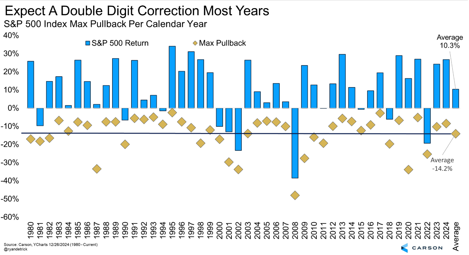 In the end, the S&P 500 pulled back 8.5% from peak to trough, the largest drawdown of the year. Take note though that since 1980 the largest drawdown of the year has averaged 14.2%. If most investors went into each year expecting a double-digit correction as uncomfortable but perfectly normal, they probably wouldn’t get so worried when it happens. If it doesn’t happen at all in a year then all the better, but the odds of it happening the next year increase. In the end, 23 of the previous 44 years saw a double-digit correction, with 13 of those 23 years still finishing positive.