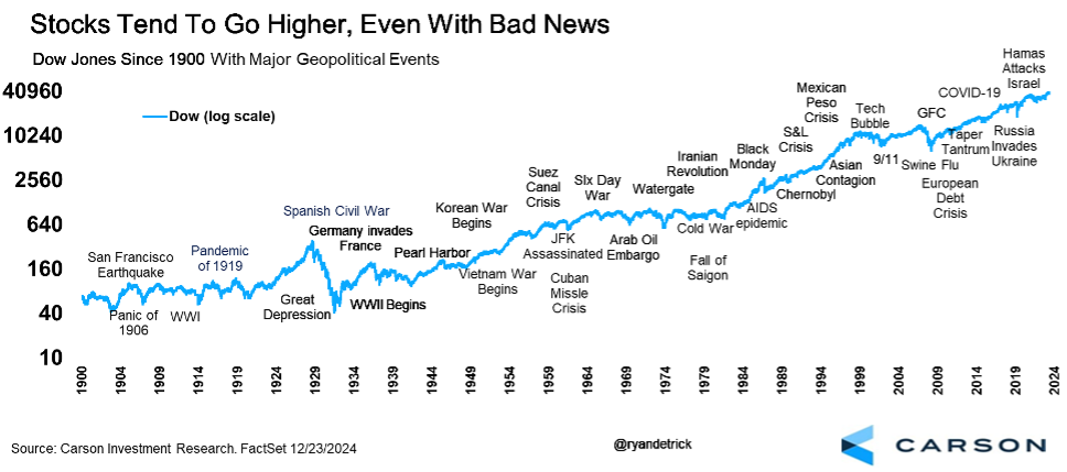 This is our last market commentary of 2024, and it may be the most important. The foundation of long-term investing success is understanding how markets behave in the long run. We share more tactical views as well, and they’re also important. In fact, in the second half of today’s commentary we look back at the recommendations we shared at the beginning of the year in our 2024 Outlook and how they turned out. (Our 2025 Outlook is coming out in just a couple of weeks!) But emotions can run high over shorter periods of time and that makes us all more vulnerable to poor decision making. Understanding the bigger picture helps tune out the noise, avoid some potential big mistakes, and stay on target to reach long-term goals.