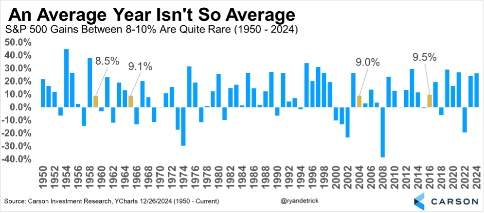 Stocks gain about 9% on average, but a little known secret is that something near the average return rarely ever happens, in fact, much larger moves, both higher and lower, are quite common. Incredibly, going back to 1950 stocks had ‘about an average year,’ with a return between 8% and 10%, only four times, and the average return in an up year is 17.6%.