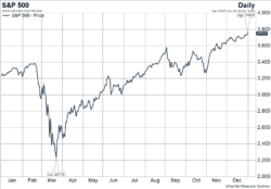 The S&P 500 wrapped up a surprising year with another strong week. The index of large-cap stocks, including dividends, climbed 1.5% and finished 18.4% higher for the year. Figure 1 shows the performance of the S&P 500, ex-dividends, in 2020 and just how far stocks have roared back from their lows. Global stocks powered 1.4% higher last week to finish the year up 16.3%. The Bloomberg BarCap US Aggregate Bond Index gained 0.2% and finished up 7.5% for the year.