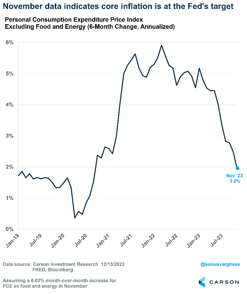 The good news is the November CPI and PPI data indicate that core PCE was flat month over month in November. That means core inflation, using the Fed’s preferred metric, has run at an annual rate of 2.1% over the last three months and 2% over the last six months.