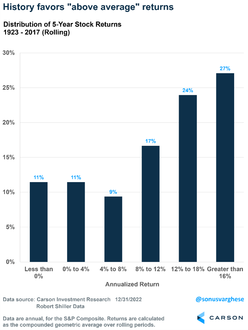 The average return over rolling five-year periods from 1923 through 2017 is about 11% (before inflation). However, in 49 out of the 96 five-year periods (51%), returns were higher than 12% annualized, i.e., greater than 75% overall through the power of compounding. In fact, returns were under 8% in only 31 periods (32%).