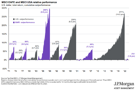 It may sound odd to suggest the 2020s will likely be the American decade, especially from the perspective of the stock market. U.S. stocks vastly outperformed international over the prior decade, and as this chart from J.P. Morgan illustrates, periods of outperformance tend to revert. But we’re going against the grain here.