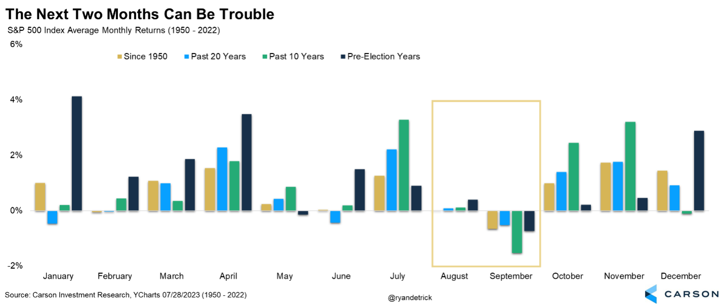 At Carson, we have been overweight stocks all year, expecting strong gains. But we are paying close attention to the fact that some well-known bears have thrown in the white flag and upped their targets. From a contrarian point of view, this could be a near-term warning sign. Another potential concern is August and September are historically two of the weakest months of the year.