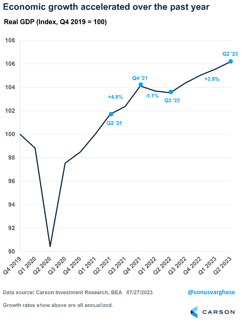 - The economy grew 2.4% in the second quarter and has expanded 2.6% over the past four quarters, which is faster than the pre-pandemic growth rate.