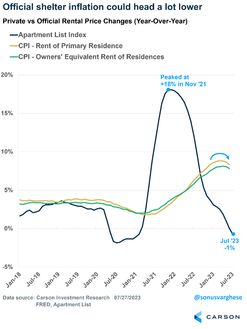However, private rental data indicate more deceleration is coming. In fact, the Apartment List data for July indicates rental prices fell 0.7% year-over-year. Additionally, multi-family construction is at a record high, which means more rental units will come online later this year and into 2024, putting more downward pressure on rents.