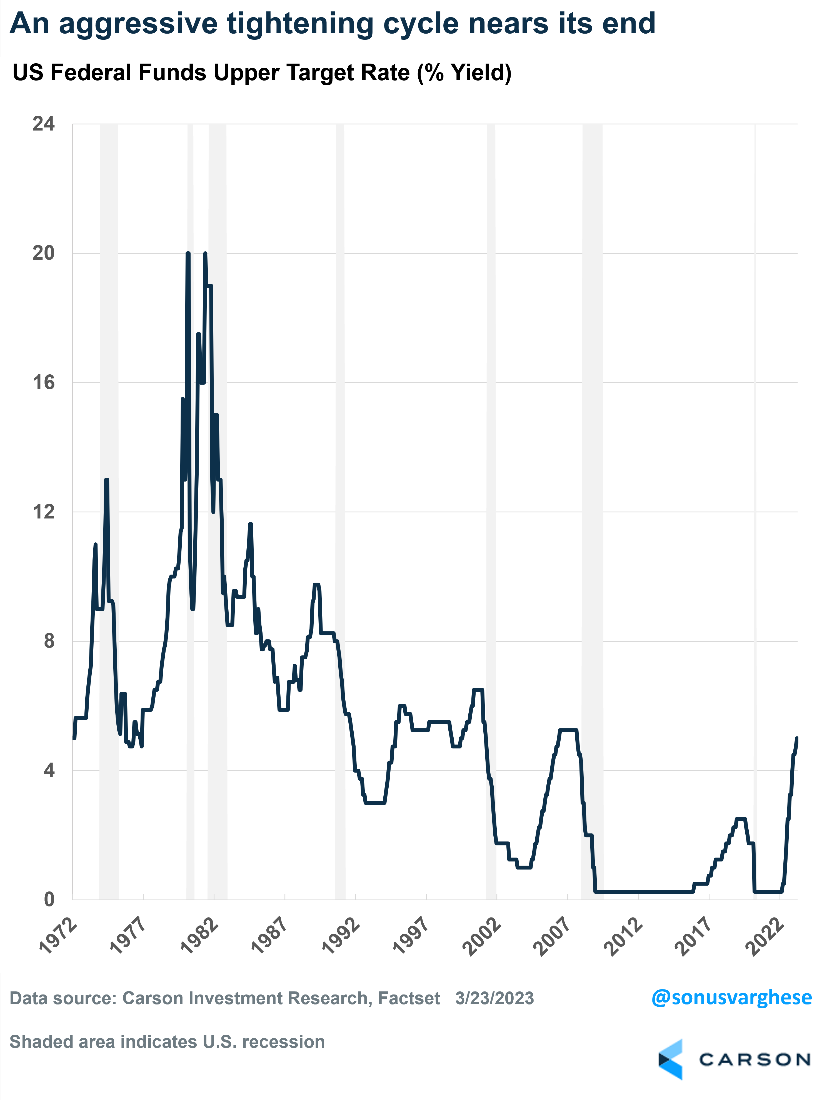 The Federal Reserve raised the federal funds rate by 0.25% at its March meeting, bringing it to the 4.75-5.0% range. This is the ninth straight rate increase and brings rates to their highest level since 2007. However, the most aggressive tightening cycle since the early 1980s, during which the Fed lifted rates from near zero to almost 5%, is near its end.