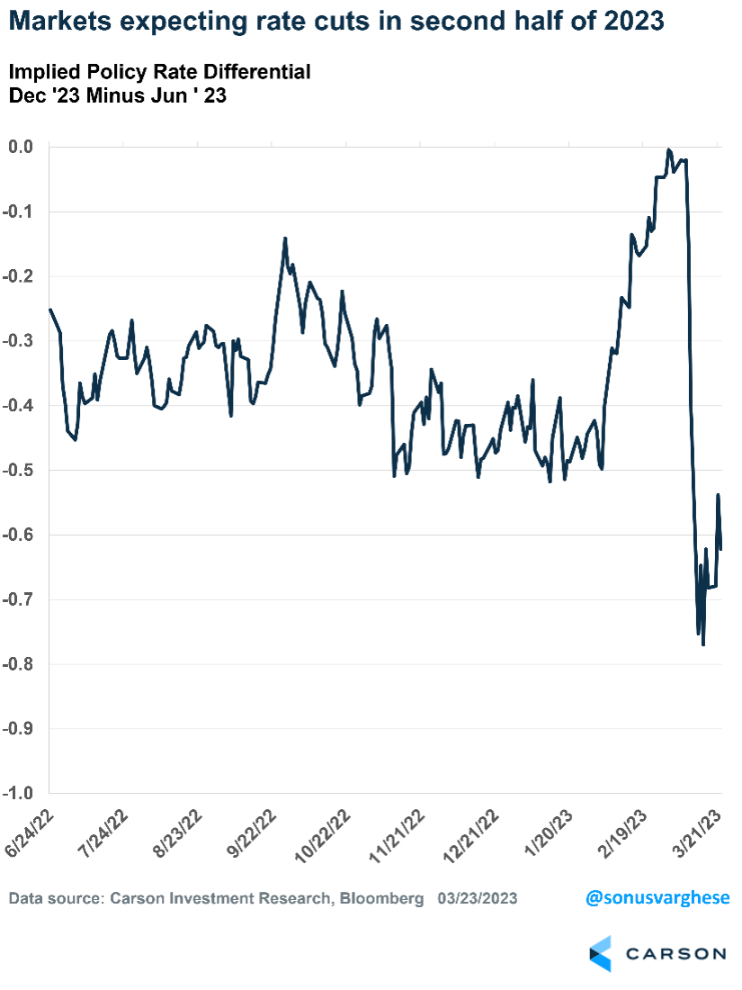 • Fed expectations move lower — if the banking sector comes under renewed stress, credit conditions tighten significantly and eventually lead to weaker data.