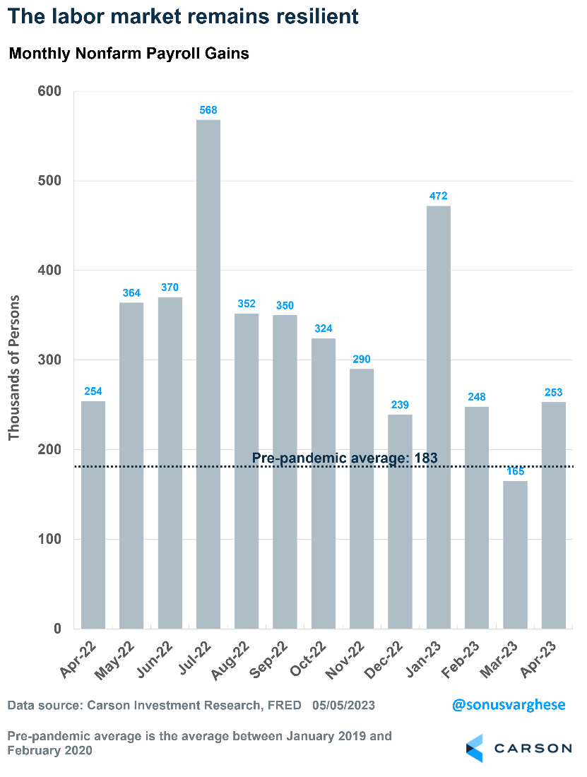 If you were worried about a sudden stop for the economy on the back of a banking crisis, fear not. The April employment data suggests the economy is doing just fine, and perhaps more than fine. Of course, the banking crisis is a problem. Banks are tightening credit availability, but that will likely be a slow-moving adverse force on the economy.