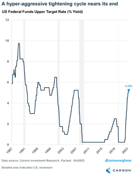 The rate hike in May was expected, but more welcome was the fact that the Fed didn’t think “additional policy firming may be appropriate.” While this was not an explicit signal that Fed officials are pausing, it indicated they will be more data dependent. Fed Chair Jerome Powell explicitly referenced this in his comments about the future direction of policy, saying it will be assessed based on incoming data, including employment and inflation. The Fed has done a lot — and officials believe the economy is yet to reflect the full impact.