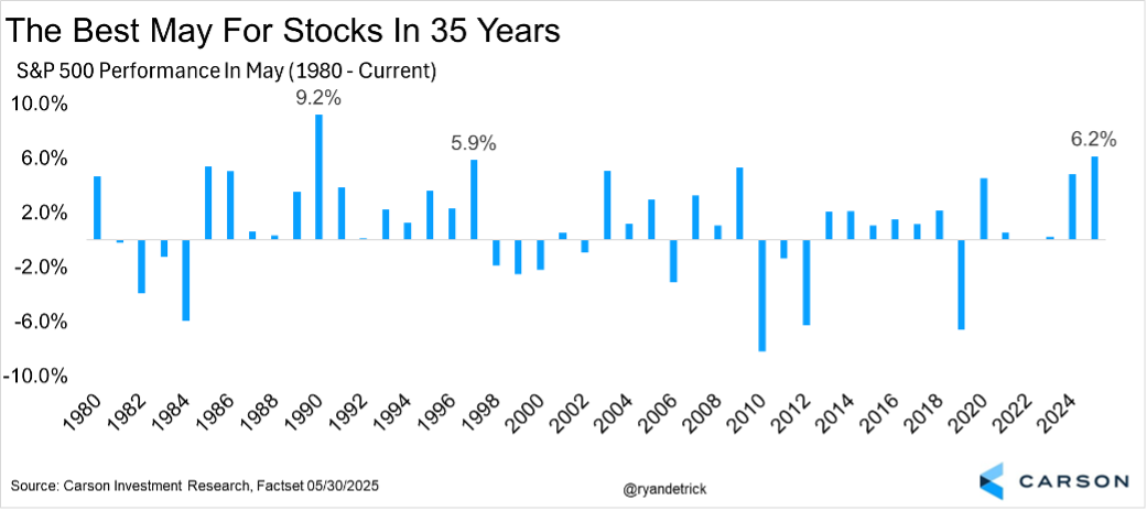 At the start of the month investors were still battered from March and April volatility and uncertainty around trade and the economy. As we noted at the start of the month though, stocks were extremely oversold and any good news (which we expected) could spark a big rally. Sure enough, that’s what we saw, as the S&P gained 6.2% for the best May return since 1990.