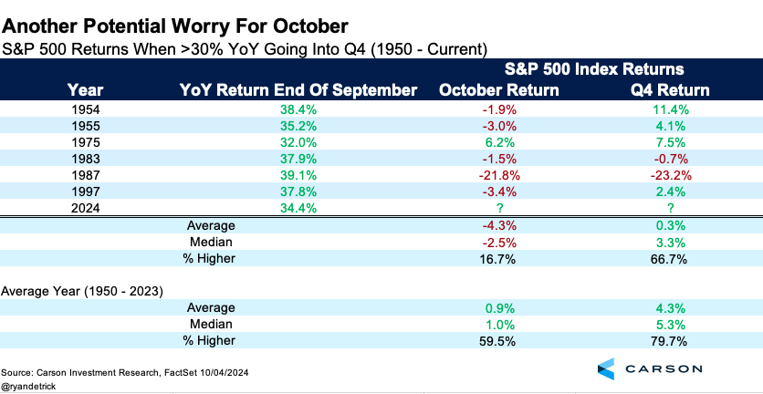 As we laid out last week, October can be volatile and historically the S&P 500 hasn’t done well in October during an election year, but the good news is November and December tend to be quite strong after the October seasonal weakness. Turning to times the S&P 500 was up at least 30% the previous 12 calendar months heading into October, there is reason to be on the lookout for some near-term weakness, as stocks fell five out of six times in October after such a strong prior year. But it is worth that outside 1987, the S&P 500 did make gains the final two months of the year.