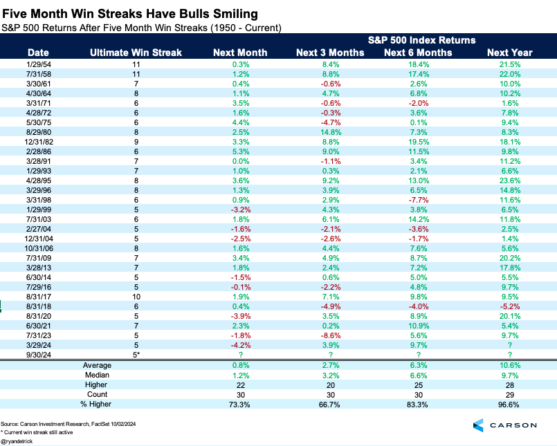 Going all the way back to 1950, we found 29 other five-month win streaks and stocks were higher a year later 28 times, for a win rate of nearly 97%. Yes, this is just one signal and we would never suggest investing based on a single data point, but looked at in the context of all the bullish signals we continue to see, this further reinforces our overall bullish stance.