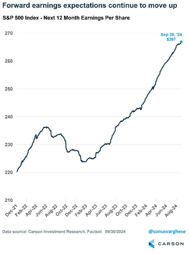 In other words, most of the returns have come from profits (and dividends). Profit expectations continue to move higher, driven by strong sales growth (which tells you that the economy is doing well) and profits margin growth (which tells you companies are in good shape and have operating leverage).