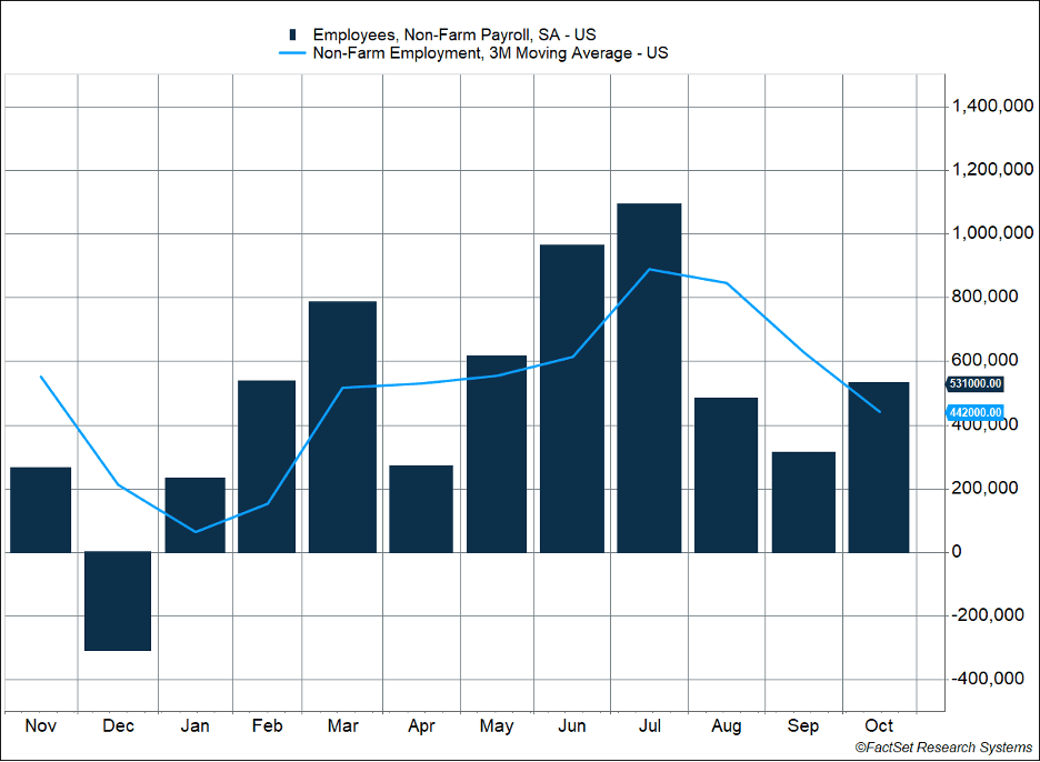 - The U.S. employment report was full of good news. Nonfarm payrolls increased 531,000 in October and previous months were revised higher.