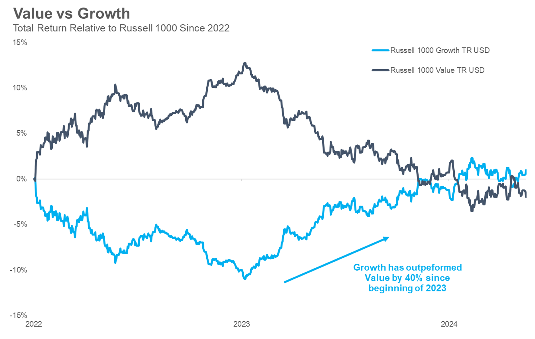 Resurgent interest rates have not been enough to slow the equity rally in 2024, as growth stocks have led the way once again, building on strength in 2023 on the back of artificial intelligence hype and strong earnings results. Beneath the surface are signs of waning strength in growth stocks and broadening participation in value stocks. This strength in the top growth names is nothing new, but it has pushed valuations to new highs relative to the rest of the market, where we see several attractive opportunities.