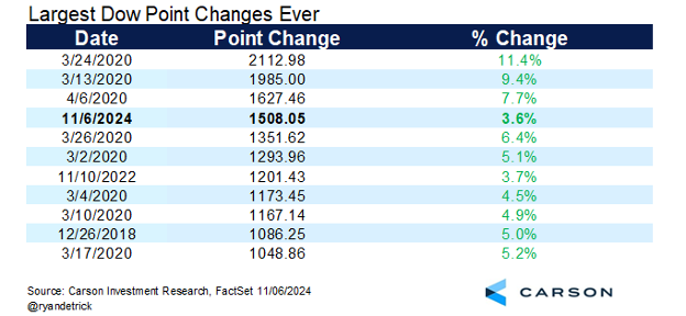 Optimism over lower taxes, deregulation, animal spirits and improved small business confidence all sparked a huge stock rally the day after the election, with the Dow up more than 1,500 points for the fourth-largest point gain ever, while the 3.6% gain was the best in exactly two years.