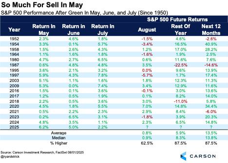 In fact, stocks were up in May, June, and July in 2025, something that has surprisingly happened three years in a row and five of the past six years. The good news is when these three months have been higher, the rest of the year (final five months) was higher 15 out of 17 times and up nearly six percent on average with more than an 8% median return. Remember, that’s over just five months and is good news indeed for the bulls.