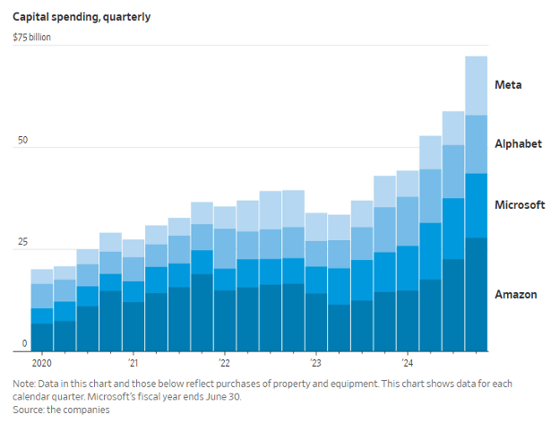And this doesn’t look like it’s about to end anytime soon. The AI arms race is accelerating with the biggest tech companies only increasing their spending. In their recent earnings call, Meta said they anticipate full year 2025 capital expenditures (capex) to be in the range of $64-$72 billion and to grow by another $30 billion in 2026. Google said it plans to spend $85 billion in 2025 on capex related to the cloud and AI. Microsoft is going to outspend everyone—they’re planning to spend a record $30 billion on capex just in the current quarter, on the back of higher returns from its already massive investment in AI. Together with Amazon, these four companies alone are expected to spend close to $400 billion in 2025 on AI-related capex, about $120 billion more than in 2024 and more than what the EU spent on defense last year.