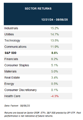 Rather than impacting employment, at least so far, a more immediate consequence of the AI boom is that there is also an increasing need to power AI infrastructure, which is why the utilities sector is the second-best performing sector year to date as of August 6, with a near 15% return. That is even better than the Technology sector (+13.5%), let alone the broad S&P 500 index (+8.6%).