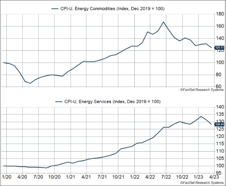 Energy makes up about 7% of the inflation basket, split almost equally into commodities, such as gasoline, and services, such as electricity and piped gas. Thanks to the pullback in oil prices, energy commodity prices are now below where they were in December 2021. The recent drop in natural gas prices has also sent services prices lower over the past couple of months.