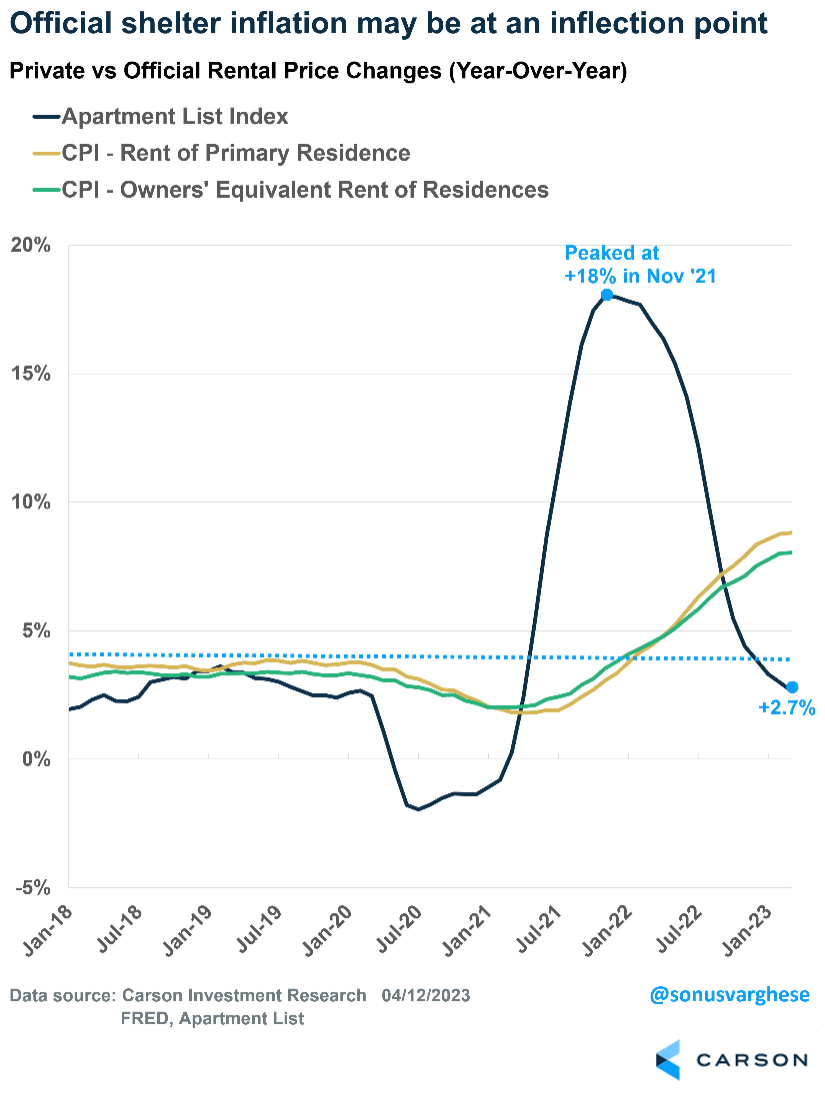 Of course, as we’ve written about in the past, market rents have already sharply decelerated. But the official inflation data has been slow to catch up to that reality. That may be changing now, which suggests core inflation may slow down the rest of this year.
