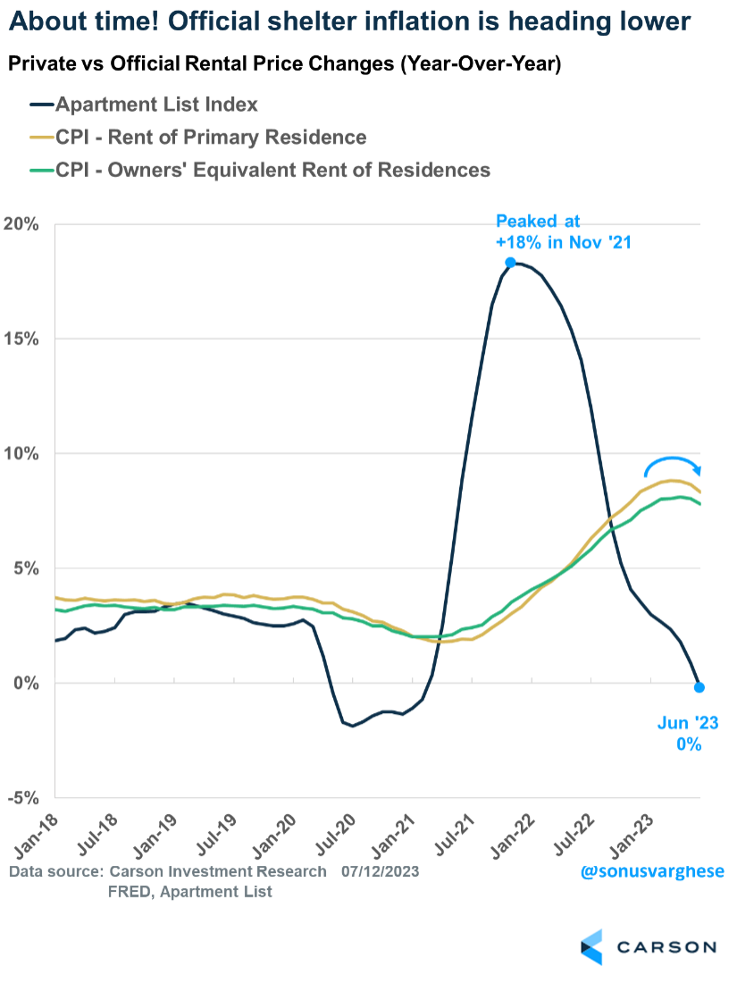 The big one is housing inflation. Housing makes up 40% of core inflation, but importantly, it does not include home prices. Instead, it’s based on rents. The problem is that there is a significant lag between official rental inflation and private rents data. Private data from Apartment List shows that rents have decelerated from a peak of 18% year-over-year pace to zero as of June! Official data lags this data by about 12 months or so and it’s taken a while to reflect market reality.