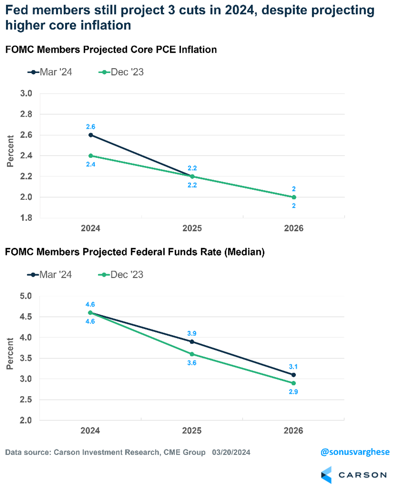 All this to say, the Fed’s still projecting three cuts in 2024 — taking the federal funds rate down from 5.4% to 4.6% by the end of the year — even as Fed members upgraded their view on the economy and projected core inflation to remain above their target of 2%. It’s one thing to project rate cuts in the face of a slowing economy and lower inflation. But they did the opposite, and that’s a big deal.