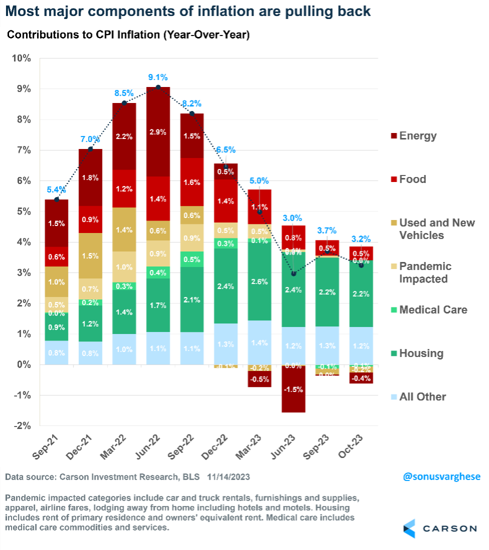 The October Consumer Price Index (CPI) report was chockful of good news. Headline inflation was flat in October, below expectations of a 0.1% increase. The October “surprise” came on the back of lower gasoline prices, which fell 5%. That is particularly meaningful because households have more income to spend elsewhere — keeping consumption and the economy humming. Headline inflation has pulled all the way back from 9% year-over-year in June 2022 to 3.2% in October. The big decline was accompanied by lower energy prices, but as the chart below shows, all the other contributors are shrinking, too.