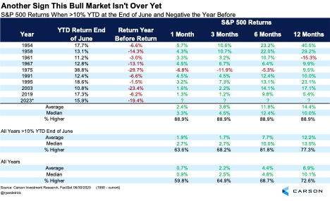 At 2023’s midway point, the S&P 500 was up 16.9% on a total return basis, which marked the best start since 2019; the NASDAQ total return was up 22.9%, which was the best start in 40 years; and the NASDAQ-100 total return was up an incredible 40.3%, marking the best start to a year in the index’s history.