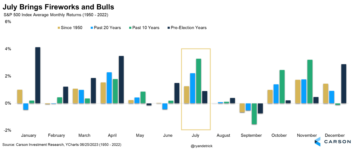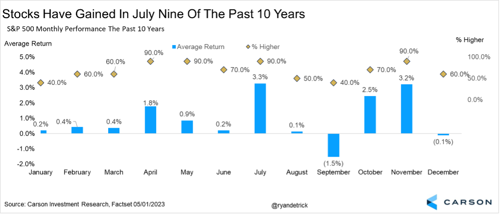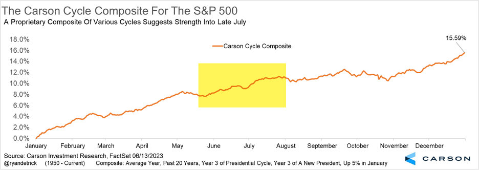 Below is our Carson Cycle Composite, which is a proprietary indicator that combines the last 20 years, pre-election years, the third year of a new president, and years that saw stocks gain at least 5% in January, such as they did in 2023. As the chart shows, a rally in July is normal and we don’t expect 2023 to be any different.