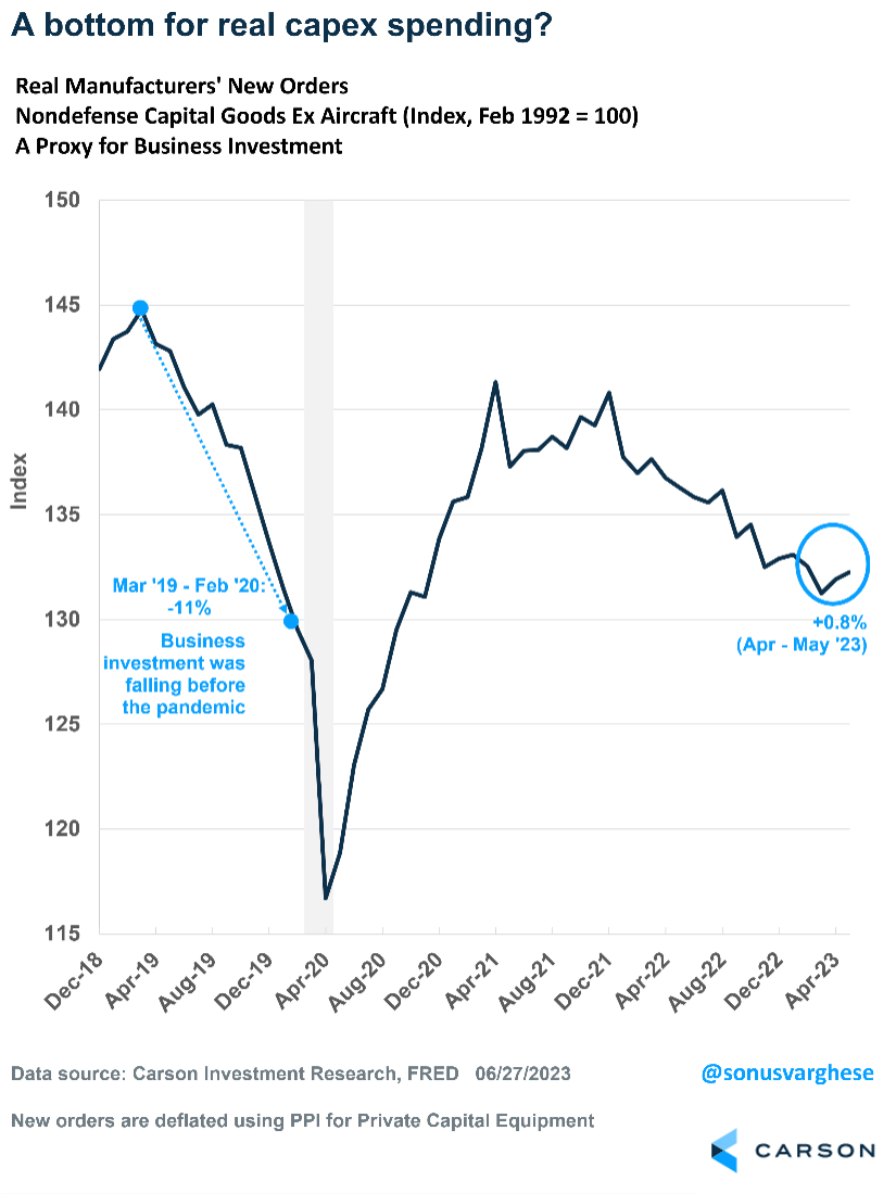 What’s left is a key economic data point — a category called nondefense capital goods ex aircraft, which is a proxy for business investment, or capital expenditures (capex). This rose 0.7% in May, yet another data point that beat forecasts as expectations were for a 0.1% increase. New orders for these core capital goods are now up 2.1% from last year and have risen at a 3.2% annualized pace over the first five months of this year.