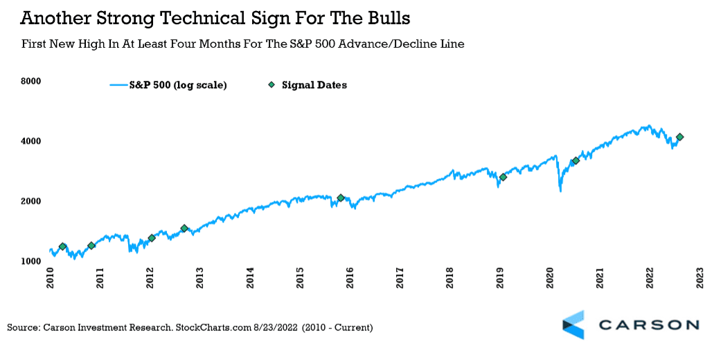 Now for the good news. The S&P 500 advance/decline line recently made a new all-time high. An advance/decline line is simply how many stocks are going up versus down each day, which is then tallied up over time. What investors need to know is new highs in breadth can often signal new highs in the overall index. The chart below shows the last seven times this indicator made a new high for the first time after a period (four months) of no new highs. Although some periods of weakness followed initially, after one year stocks were higher every single time, up 15.6% on average.
