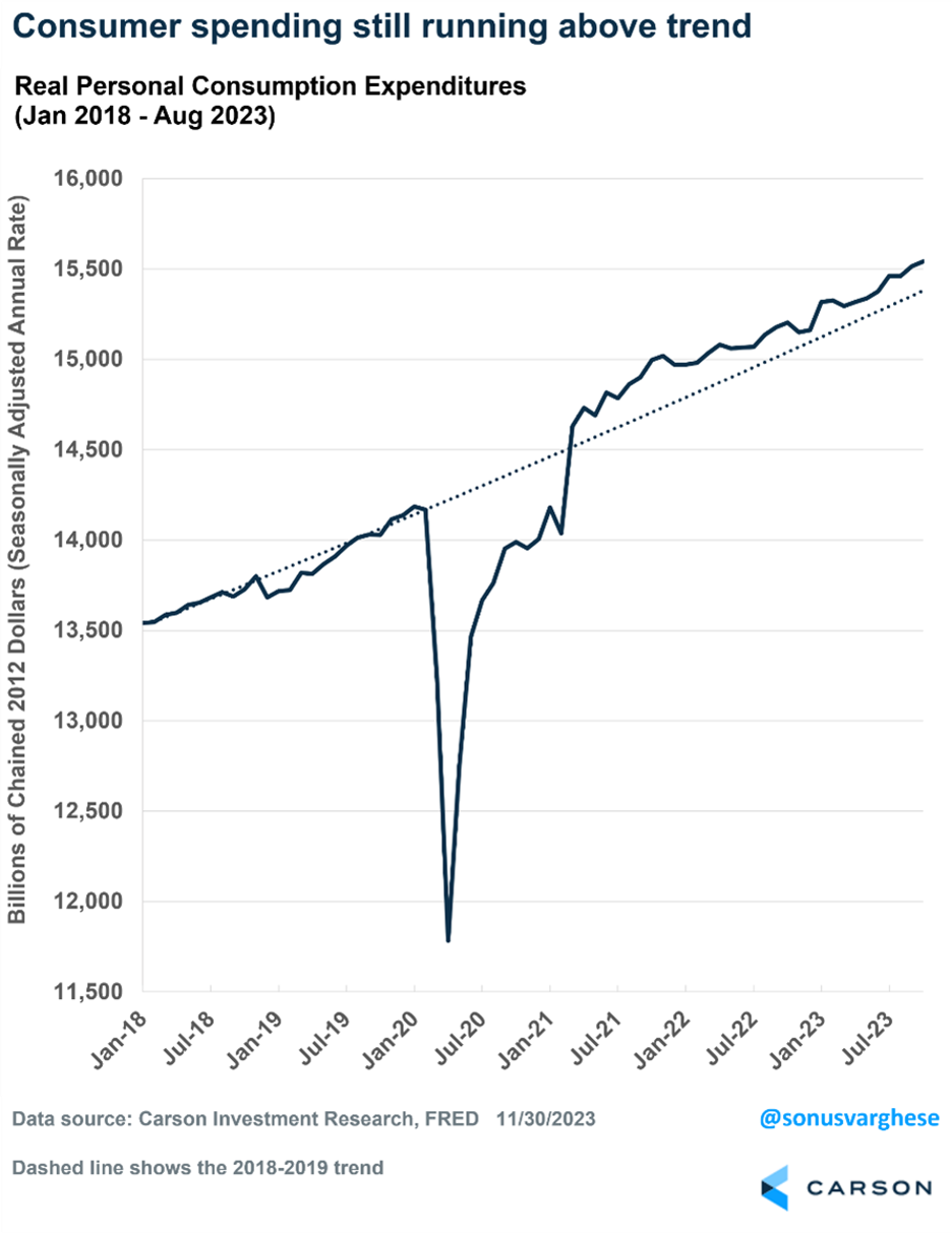 Lastly, the employment backdrop remains very strong. In fact, another 199,000 jobs were added in November, above expectations for approximately 180,000. Workers returning after the end of the autoworkers and Hollywood strikes provided a boost, but the three-month average is a 204,000 gain. For perspective, job growth averaged 163,000 a month in 2019. The economy needs about 100,000-125,000 net new jobs a month to keep up with population growth.