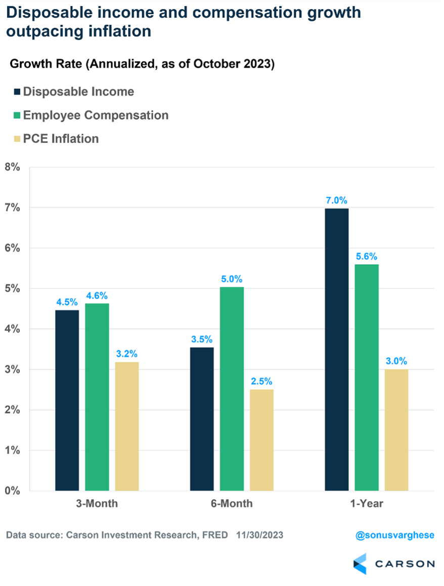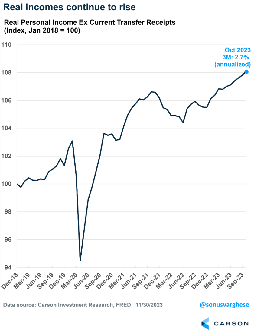 We frequently hear about how badly consumers are doing and that they will be tapped out soon. However, the data shows that isn’t the case. Would you believe real incomes are at an all-time high? Given consumers make up close to 70% of the economy, this bodes well for continued spending.
