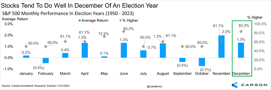 Second, December is the S&P 500’s second best month of the year in an election year, with only November better. Given stocks have soared so far in November, this one is playing out again so far. Also note, December is higher 83.3% of the time, making it the most likely month in an election year to be higher.