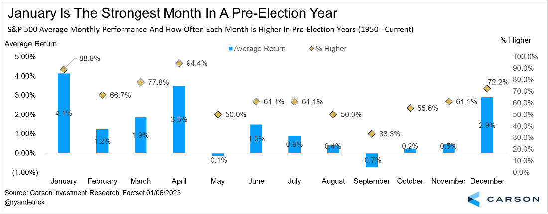 Lastly, strength in the first month of a pre-election year is nothing new. In fact, January is typically the best month in a pre-election year, up a very solid 4.1% on average. The first few months of a pre-election year also tend to be strong based on seasonality, which investors should be open to yet again.