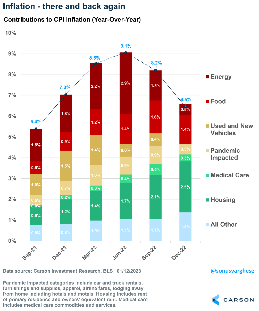 We now have a trend! Headline inflation fell 0.1% in December, the slowest pace since May 2020. Inflation has now decelerated to 6.5% year-over-year, quite a pullback from the 9.1% level six months ago.