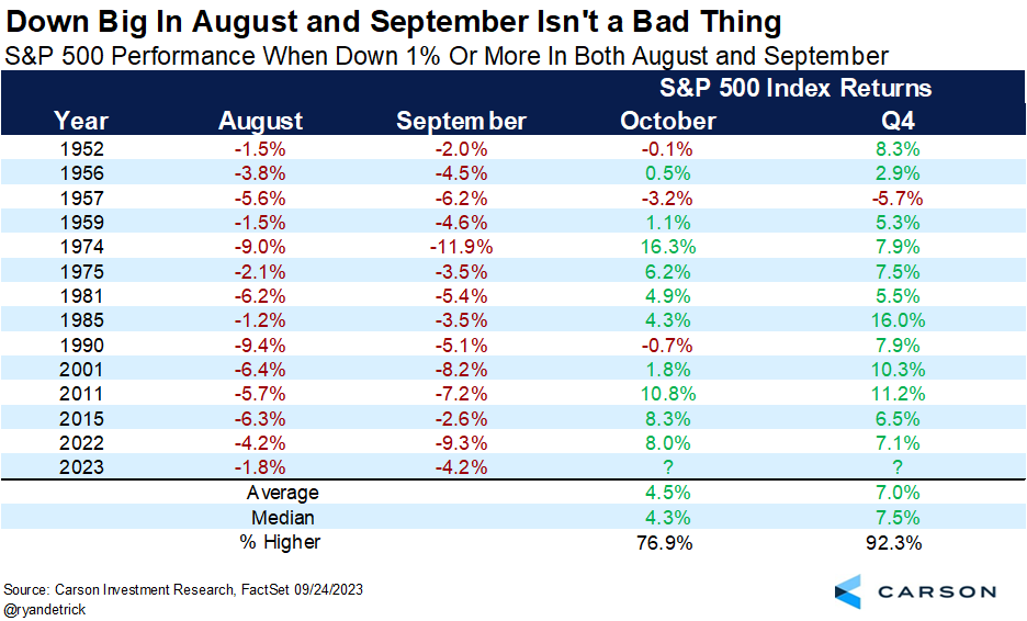 The fact that stocks sold off in both August and September could indicate a strong fourth quarter. In fact, a review of past returns shows when both months were down at least one percent or more, such as they were this year, the fourth quarter was up 7.0% on average and has been higher 12 out of 13 times since 1950. So while investing hasn’t been fun the past few months, we wouldn’t bet against a late-year rally.