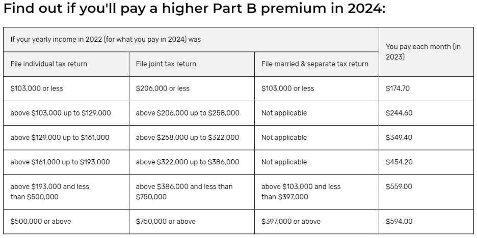 It varies, depending upon your total income from the 2nd prior tax year (2022 Income for 2024 Part B premiums). The 2024 monthly Medicare Part B premium is $164.90 See the chart below for reference.